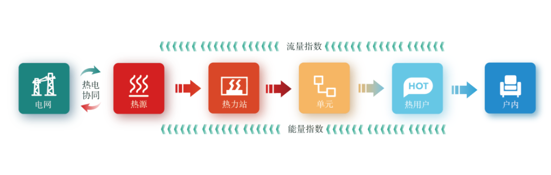 傳統的供熱系統是以“能源生產為導向”,熱源側保持供應總量,用戶側分攤的“推動式”供熱。新型“源-網-站-戶”全域協同的供熱模式是以“負荷需求為導向”根據實際需求生產的熱量的“拉動式”供熱。利用新一代信息化技術,將水力平衡和熱力平衡的調控需求歸一為各個層級的標準流量指數和能量指數,按“戶內-熱用戶-單元-換熱站-熱源”的順序逐級依次向上傳遞,能量逐級向下精準配送,進而實現包括“熱電協同”在內的“源-網-站-戶”全域協同。
