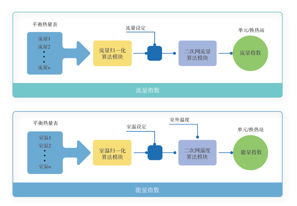 換熱站的流量指數由各熱用戶的流量加權平均而成,并進行歸一化處理。流量指數作為二級網循環量閉環控制反饋信號,實現水力的精準調控,降低循環水泵電力消耗。采用具備室溫軟測量算法的平衡熱量表作為熱用戶的智控終端,能量指數由各熱用戶的室溫軟測量數據加權平均而成,并做歸一化處理。換熱站的能量指數進一步向熱源端反饋熱量需求,標準化的能量指數使得熱源端能根據各個換熱站的能量需求情況統一分配熱能給各個換熱站,實現熱源的精準調控。采用以能量指數為核心的熱能分配體系,熱源可以充分利用供熱系統的熱惰性最大限度地考慮電力系統的負荷特性,采取主動削峰等技術手段,降低電力系統的容量投資。